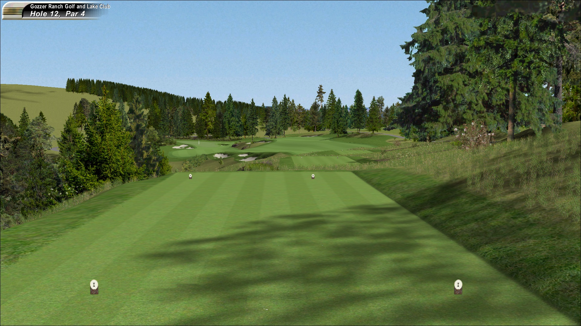 This rendition is identical to the real course for tees I,II,III and IV. I have taken the liberty of relocating tee V (Ladies tee) in an attempt to make the Gozzer Ranch more of a challenge in APCD. (My apologies to Mr Fazio.)