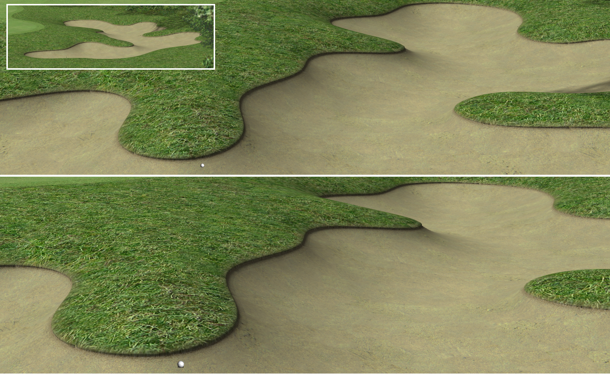 A word about the lips. As Pete mentioned, one of the frustrating things about Links is that the sand texture doesn't allow the ball to roll back toward the center of the trap, even if it is sloped. That's what I consider a flaw in the way the sand texture is programmed. IRL, there should be no way for a ball to come to rest on a slope in sand, unless it's being held there by a divot, or something other than normal sand. In Links there have been many times I have had a ball come to rest on a 90 degree sand slope. IRL that's impossible.
